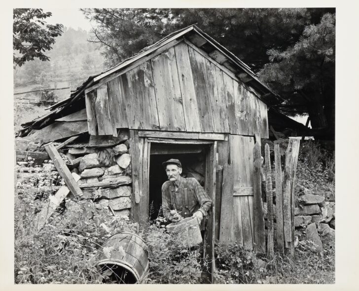 A man stands in the doorway of a wooden structure built into an incline. He holds a large bucket or basket and a piece of produce.