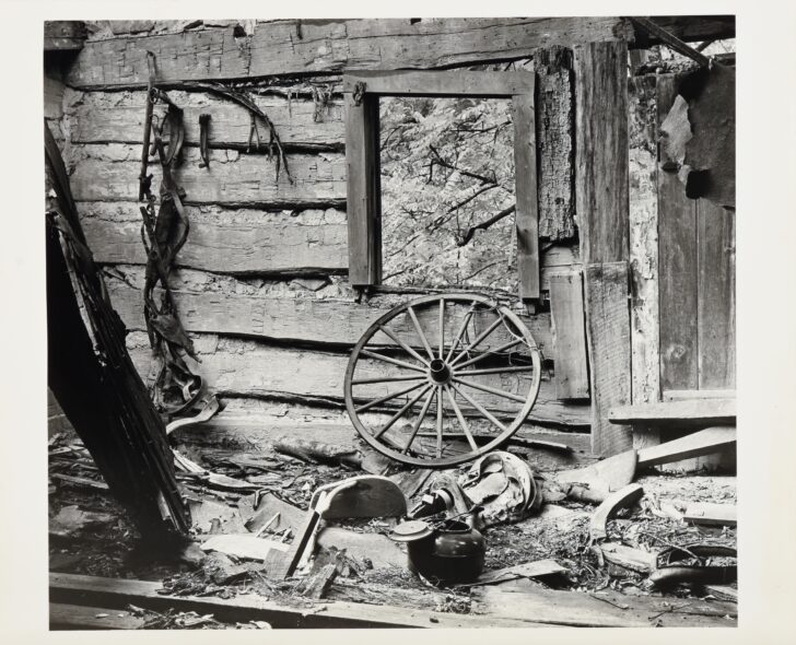 A view from the interior of a dilapidated wooden structure with a wooden wagon wheel and leather harnesses leaning against the wall.