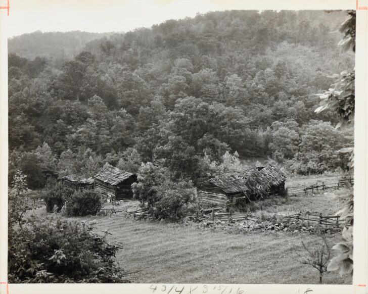 Two log structures with wooden roofs sit on a hill with cleared land in the foreground and forests in the background. The roof of the structure closest to the viewer is collapsing into the structure.