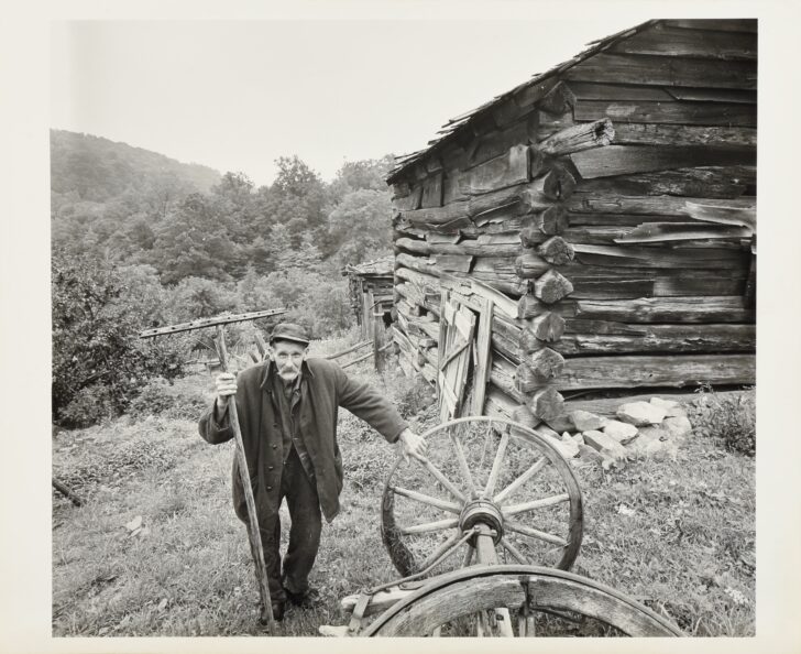 An old man wearing a billed hat and oversized coat holds a rake and leans on a wooden wheel. Behind him are two wooden structures, a wooden fence, and a heavily forested landscape.