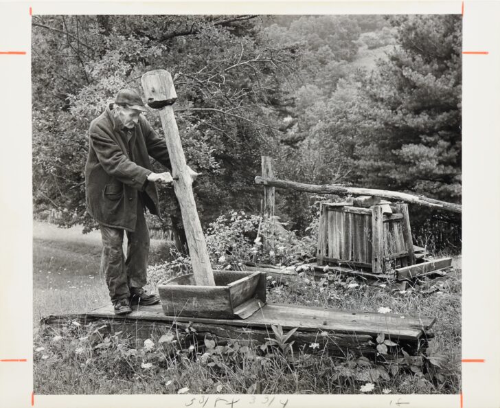 An old man wearing a brimmed hat and oversized coat stands on a wood plank with a small wooden structure behind him. He appears to be pushing a tool made of a large wooden pole and metal box across the plank on which he stands.