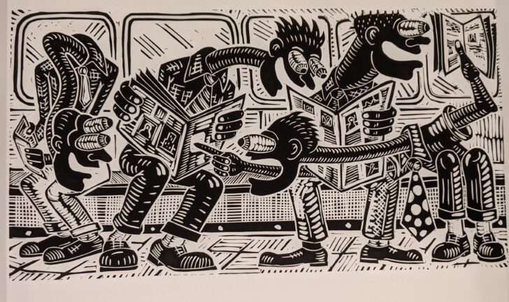 Four figures printed in black sit on what appears to be a subway car, with a bench and square windows behind them. Each figure is wearing a patterned necktie, has large, bulging eyes, and is holding a newspaper or book-type object. Three of the figures have very long necks and are looking at each other, while the fourth looks towards the viewer's right.