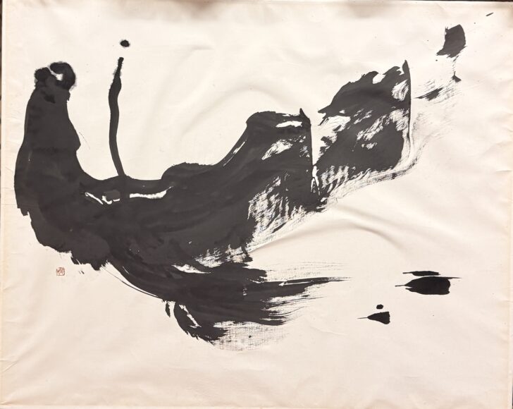 A black ink calligraphic work. A dark, painted shape rises up the left side, and extends outward and across to the right, splitting into two lines. Small dashes appear at the end of each line.