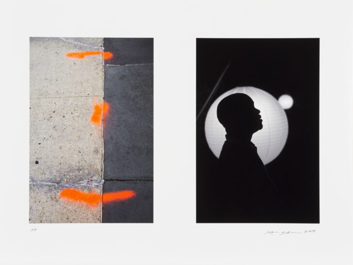 Two images side-by-side. The left features two bright orange, spray-painted lines sandwiching an orange dot. The right image is a black-and-white silhouette in front of a white globe.