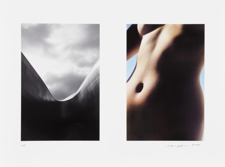 Two images side-by-side. The left is a black-and-white photograph of a curved, man-made structure against a cloudy sky. The right is a color photograph of a woman's abdomen.
