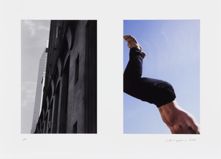 Two images side-by-siide. The left is a black-and-white image of the side of a building. The right is a color image of a man's shirtless body, the feet lifted upward and torso stretched.