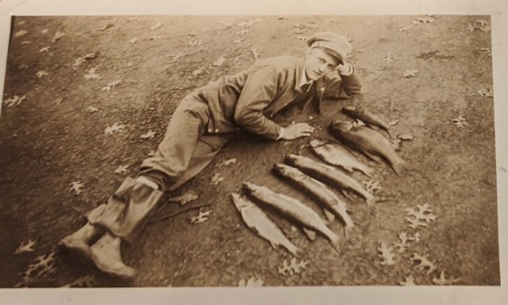 A man lays on his side on the ground, looking at the camera, with a row of seven fish next to him.