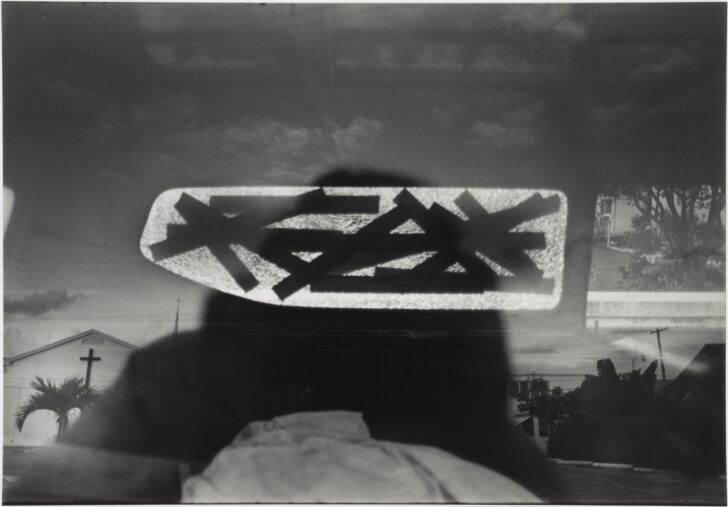 A black and white image of a window covered in tape with a church in the backgound. The image also shows the reflection of the photographer