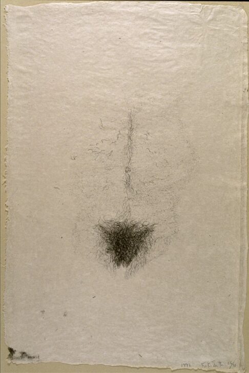 In Untitled (Torso), the viewer is presented with a somewhat andro-gynous image of a female torso. Rather than a full torso with legs and arms, this torso is simply the abdomen; no sides or extensions are presented. Instead, every hair of the body is clearly demarcated, calling attention to this overlooked aspect of a woman’s body. Hovering in the viewer’s space, this image is both present and not, emerging from and disappearing into the background.