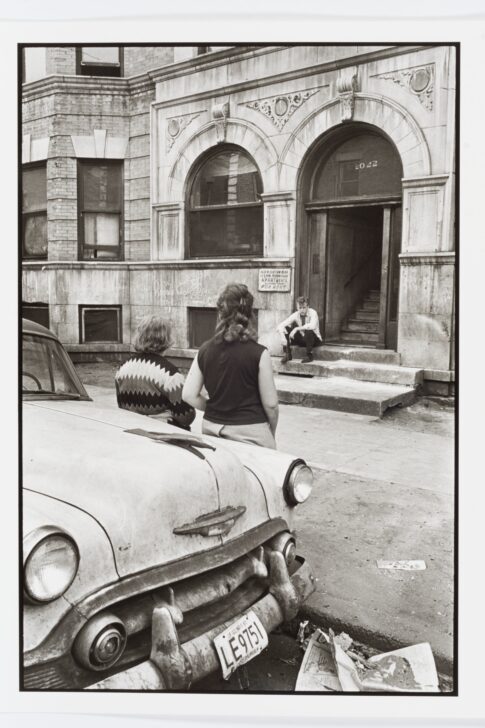 With their backs to the camera, two people lean against a dirty car with Illinois plates. A young man in an unbuttoned shirt looks towards them from the steps of a nearby building.