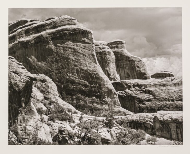 Three smoothly textured rock cliffs rise above a field of similar rock, where short trees and brush grow.