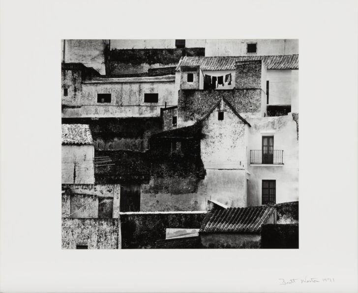 A black-and-white image of buildings, extending into the distance. Their varied textures and color, combined with an absence of depth, create an abstract composition.