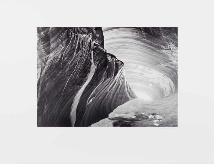 A dark rock with white vertical lines twists into lighter rock whose thin, horizontal layers from a hole.