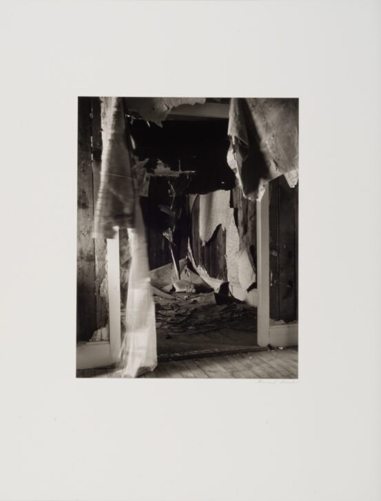 View from a white-framed doorway into a room in an abandoned building. Sheets of wallpaper fall in decaying sheets onto the debris-covered wood floor.