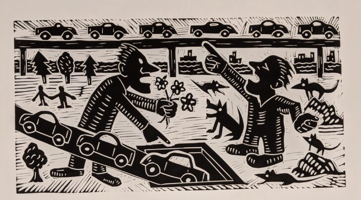 Printed in black, an open-mouthed figure holds flowers in one hand and points into a square hole with the other hand as cars drive on a road sticking diagonally out of the hole. Another open-mouthed figure points to the sky with one hand and makes a fist with the other. In the background, a waterfront with two figures holding hands, trees, four-legged animals, an overpass with cars, and boats visible in the water.
