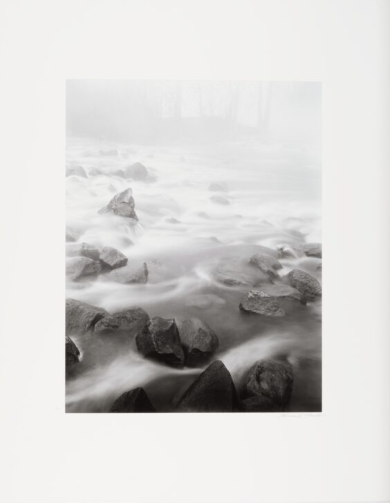 An image of water flowing over large boulders in a river. Photographed with a long exposure, the water appears like bright fog winding its way around a dry bed of rock.