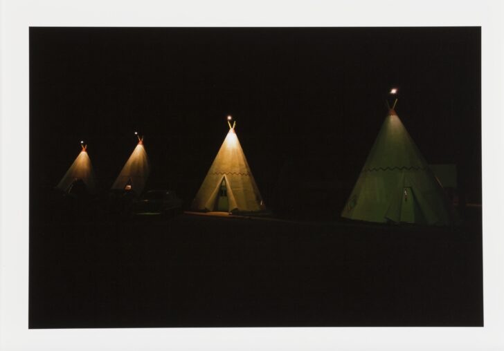 A color image of a line of four teepees, lit from bulbs positioned at their tops. Small doors are visible, as are two cars parked between the middle two teepees.