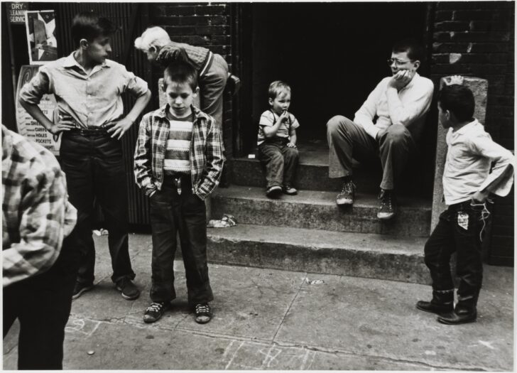 Seven children play on and around the cement stoop of a brick building. One stands with arms akimbo, while another looks towards the pavement with hands in pockets.