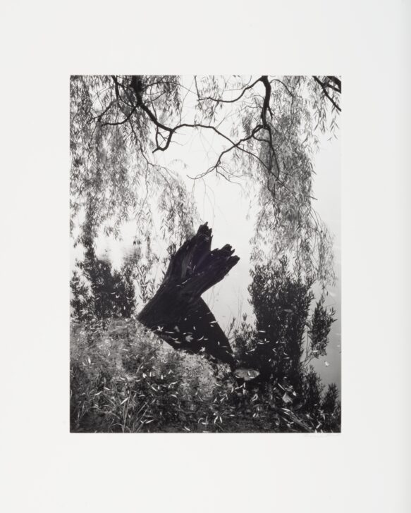 A jagged tree stump rises above the surface of a calm body of water. The branches of a tree drop down toward the water, scattering tiny pointed leaves everywhere.