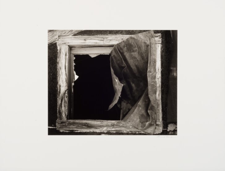 A square window is framed in wood covered with flaking light paint. The thin metal sheet that may have once covered it is now crumpled and pushed inward, nailed only to the right part of the wood frame.