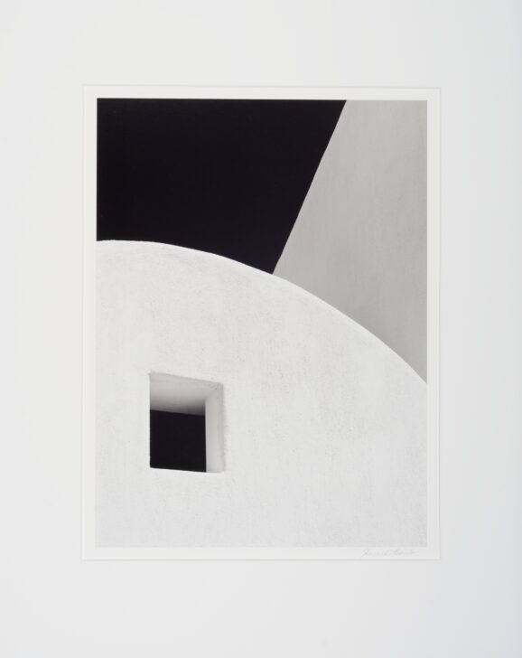 A white stucco building curving along its top edge holds a small, black, rectangular window.