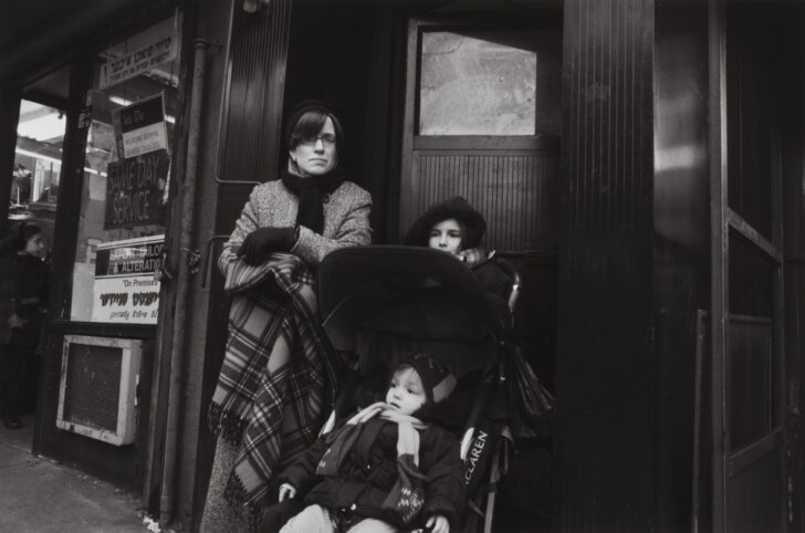 A woman with two children, one in a stroller, standing in a doorway on a city street.