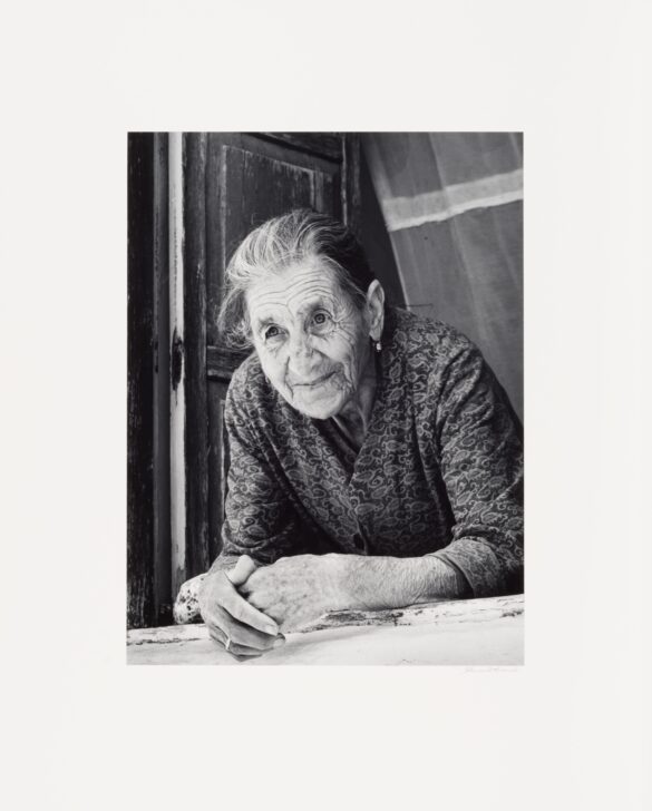 A smiling woman folds her hands as she leans out a window. Her shirt is patterned with paisleys, and a painted wooden shutter opens inward at her right side.