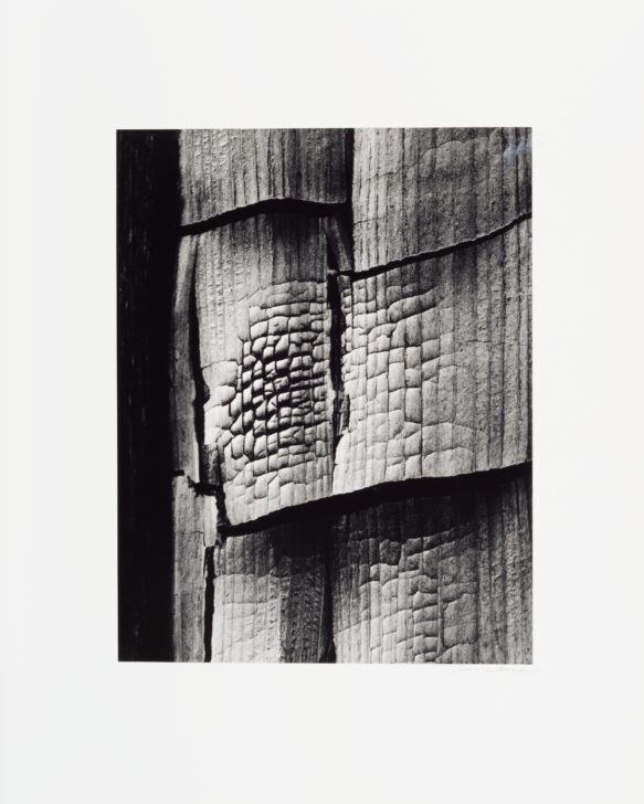 A close view of the surface of wood shows its long vertical lines broken up into rhomboid and rectangular shapes.