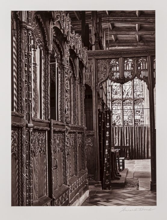 A wall covered in ornately carved dark wood from floor to ceiling fills half the left half of this image. At right, a doorway arched in similar woodwork leads to another room with stained glass windows.