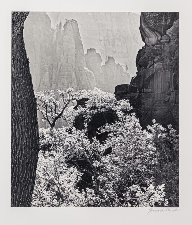 The tiny leaves on a cluster of trees are caught in sun at the foot of rock cliffs. Other rock faces stand in the distance.